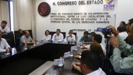 Los diputados de la LXVI Legislatura entre ellos el diputado por el distrito  XVII Motozintla, Alberlí Ramos Hidalgo fueron testigos de honor ante la firma de convenio marco de colaboración institucional entre el Congreso del Estado de Chiapas, por el presidente del H. Congreso el diputado Eduardo Ramirez Aguilar y el Lic. Juan Óscar Trinidad Palacios, presidente de la Comisión Estatal de Derechos Humanos; organismo que vela por que estos sean y se apliquen a todo ser humano que habite o vaya de paso por nuestro territorio nacional. Mismo que en las mayorías de las constituciones políticas del mundo ya se encuentran contempladas.  Con ello se busca garantizar los derechos humanos de todos aquellos que se encuentren en el territorio nacional, independientemente de su nacionalidad. Demostrándose una vez el compromiso de cada uno de los diputados por garantizar los derechos humanos de todos. FIN