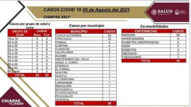 90 contagios nuevos, tres decesos reportados, 4 nuevos casos en Comitán  Tuxtla Gutiérrez, Chiapas; 5 de agosto de 2021.- El informe diario sobre la transmisión del COVID-19 en Chiapas arroja que en las últimas horas se confirmaron 90 casos en 20 municipios de la entidad y tres fallecimientos en personas de diferentes grupos de edad. La Secretaría de Salud estatal da a conocer que los casos positivos se presentaron en los siguientes municipios: Tuxtla Gutiérrez, 40; Tapachula, 22; Tonalá, seis; Comitán, cuatro; Tuzantán y Villaflores, dos cada uno; y Aldama, Amatenango del Valle, Ángel Albino Corzo, Chamula, El Parral, Huixtán, Huixtla, La Trinitaria, Larráinzar, Mezcalapa, Motozintla, Ocozocoautla, Pichucalco y Teopisca, un contagio cada municipio. Las pruebas salieron positivas en 50 mujeres y 40 hombres, de 15 años de edad en adelante, de los cuales el 27 por ciento cursa con enfermedades adicionales: hipertensión, diabetes, asma, obesidad y/o tabaquismo. En cuanto a las defunciones, la dependencia estatal comunica que se trata de dos personas del sexo femenino y una persona del sexo masculino, de 66, 58 y 38 años, respectivamente, habitantes de los municipios de Tuxtla Gutiérrez y Berriozábal; las dos mujeres con datos de co-morbilidad.